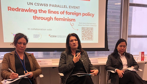 Members of the Collective joined the panel of the CSW69 Parallel Event “Redrawing the lines of foreign policy through feminism”: Lina Gálvez MEP, Chair of the FEMM Committee, Daniela Sepúlveda (PEFAL), Foteini Papagioti (ICRW), and Spogmay Ahmed (FFP Collaborative) highlighted how FFP helps to see the world differently and formulate feminist-informed policy approaches that benefit everyone. They emphasised the need for broad alliances to safeguard democratic institutions and values against far-right and anti-gender pushbacks.