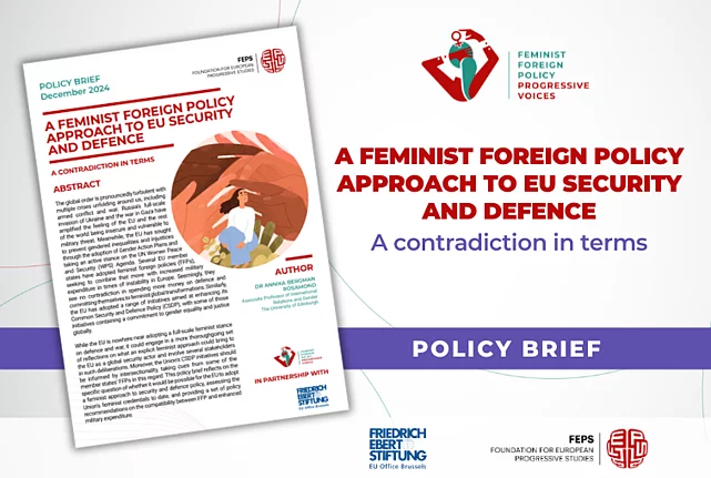 Policy Brief: A feminist foreign policy approach to EU security and defence 06.12.2024 Peace and security are at the heart of the Feminist Foreign Policy adopted by many EU Member States. Yet they have recently also increased their budget on defence. Can these notions be reconciled? Explore the question in our new policy brief. Monday, 19.02.2024 Event Policy Study Launch: How to support feminist leadership in Europe Join our the launch of our new policy study "Women CSO leaders for systemic change - How to support feminist leadership in Europe" on Monday, 19 February. Thursday, 18.04.2024 News Publication Policy Brief: A European Feminist Foreign Policy? Feminist foreign policy (FFP) has gained significant ground across the globe, but a lot remains to be done. Read some concrete policy recommendations in our new policy brief. Monday, 15.12.2025 News Feminist Foreign Policy in Action Feminist Foreign Policy (FFP) questions traditional takes on foreign relations and is becoming increasingly widespread in the political world. Find out more about our work to further the dialogue on this topic. © FEPS Opposing values in the new EU mandate? A core demand of feminist movements is the focus on peace and conflict resolution as opposed to hard security. This includes calls from demilitarisation to pacifism. Several EU Member States are committed to feminist foreign policy (FFP), yet have recently increased their defence budget. Can these contradictory developments be reconciled? A feminist take on EU Security and Defence Policy In order to answer this question, our new policy brief examines how to look at security and defence strategies through a feminist lens. Dr. Annika Bergman Rosamond highlights how Member States integrate the principles of peace and security into their respective FFP strategies and formulates recommendations for a more feminist approach to EU Security and Defence Policy. In the context of evolving geopolitical dynamics, upholding a values-based foreign policy and embedding feminist considerations and practices into the transformation of the EU’s foreign and security agenda is more crucial than ever. Read the policy brief here. A feminist foreign policy approach to EU security and defence Bergman-Rosamond, Annika | Brussels : FEPS, Foundation for European Progressive Studies, December 2024 a contradiction in terms Download publication Page 1 of 1 Page 1